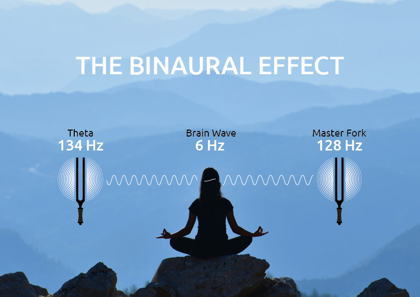 Per creare l'effetto binaurale, ovvero un'illusione audio che si ottiene quando due frequenze leggermente diverse vengono inviate a ciascun orecchio dando luogo a una nuova frequenza percepita, gli esperti Meinl consigliano di affiancare il proprio tuning fork insieme al Master Fork 128 Hz (TTF-128, disponibile separatamente) e posizionali rispettivamente sull'orecchio destro e sinistro. Il cervello percepirà la differenza tra le due frequenze, generando una terza frequenza che guida verso lo stato desiderato delle onde cerebrali.