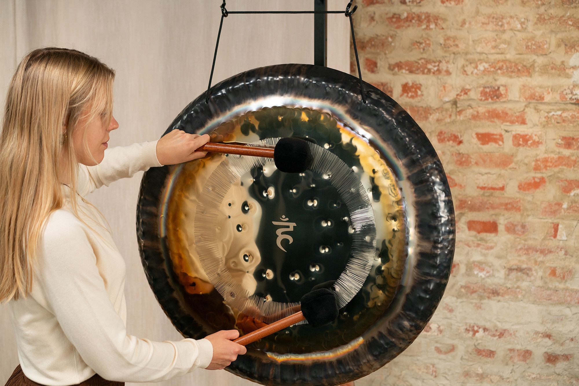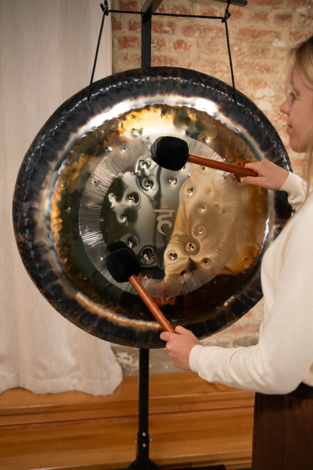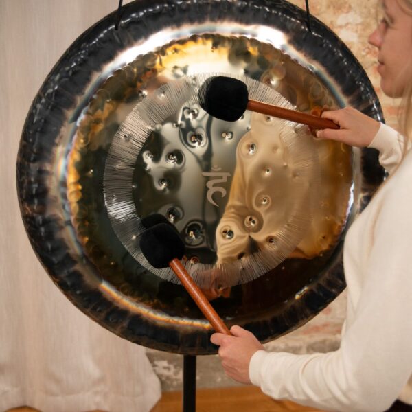 Il gong è fornito completo di guanti protettivi, ideali per maneggiarlo senza lasciare impronte, e di una cover in tessuto resistente, pensata per proteggerlo e riporlo in sicurezza dopo ogni utilizzo