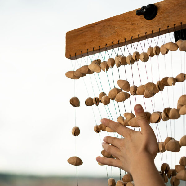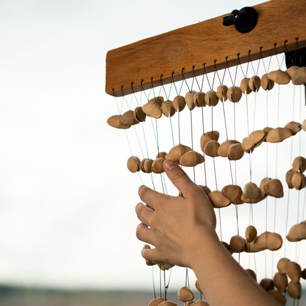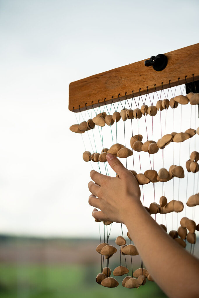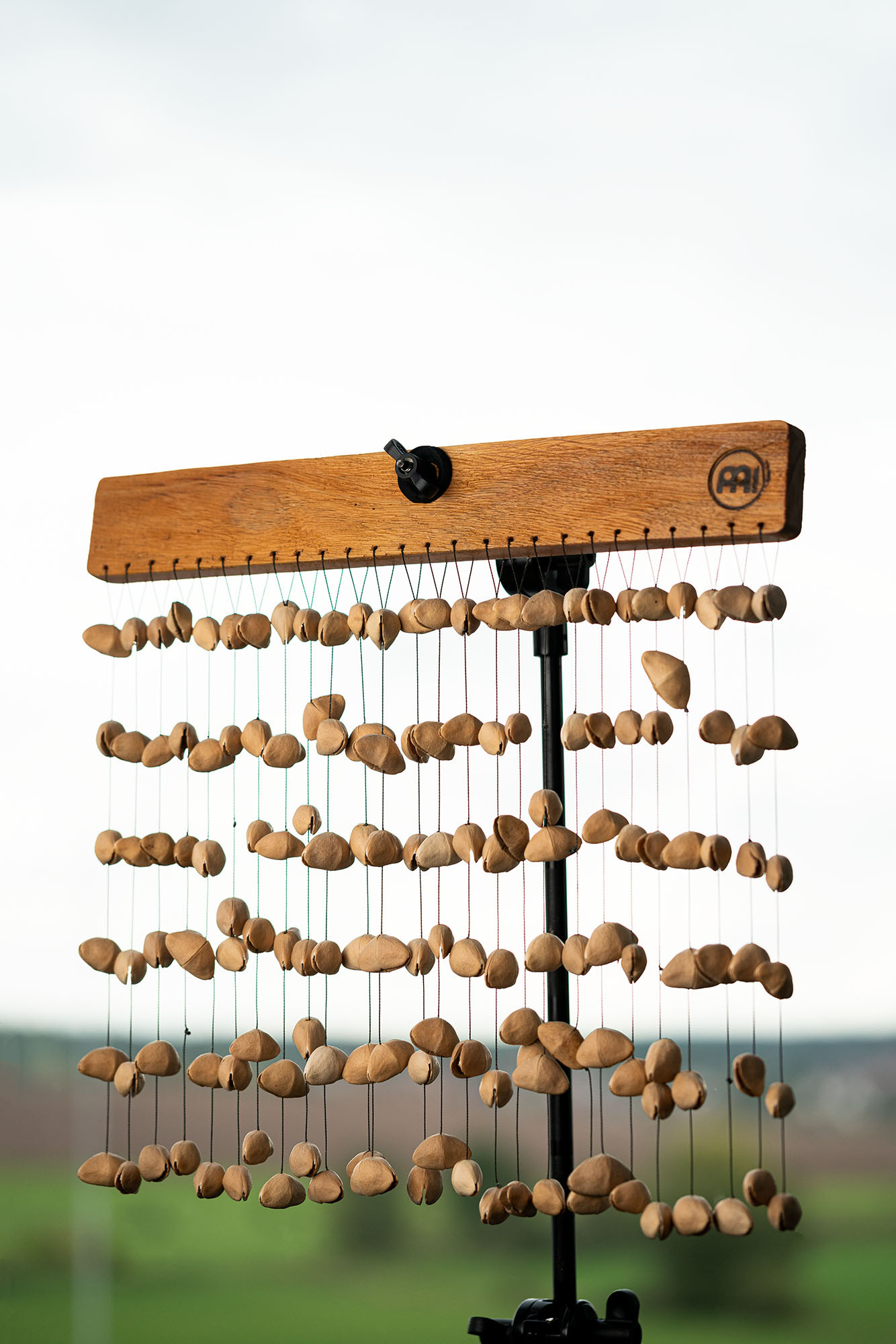 I gusci dei semi di Kenari, fissati a un solido pezzo di mogano, creano uno strumento unico e versatile.