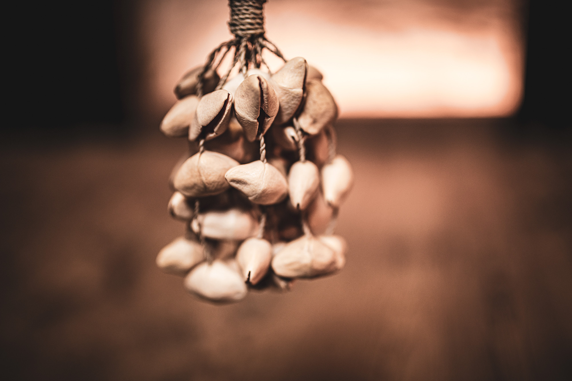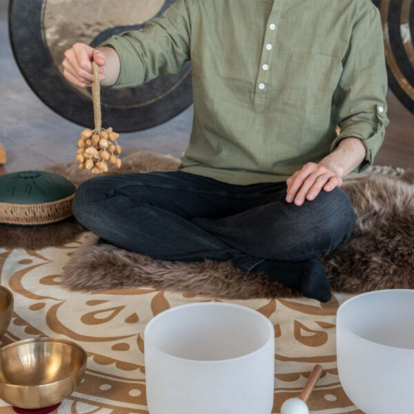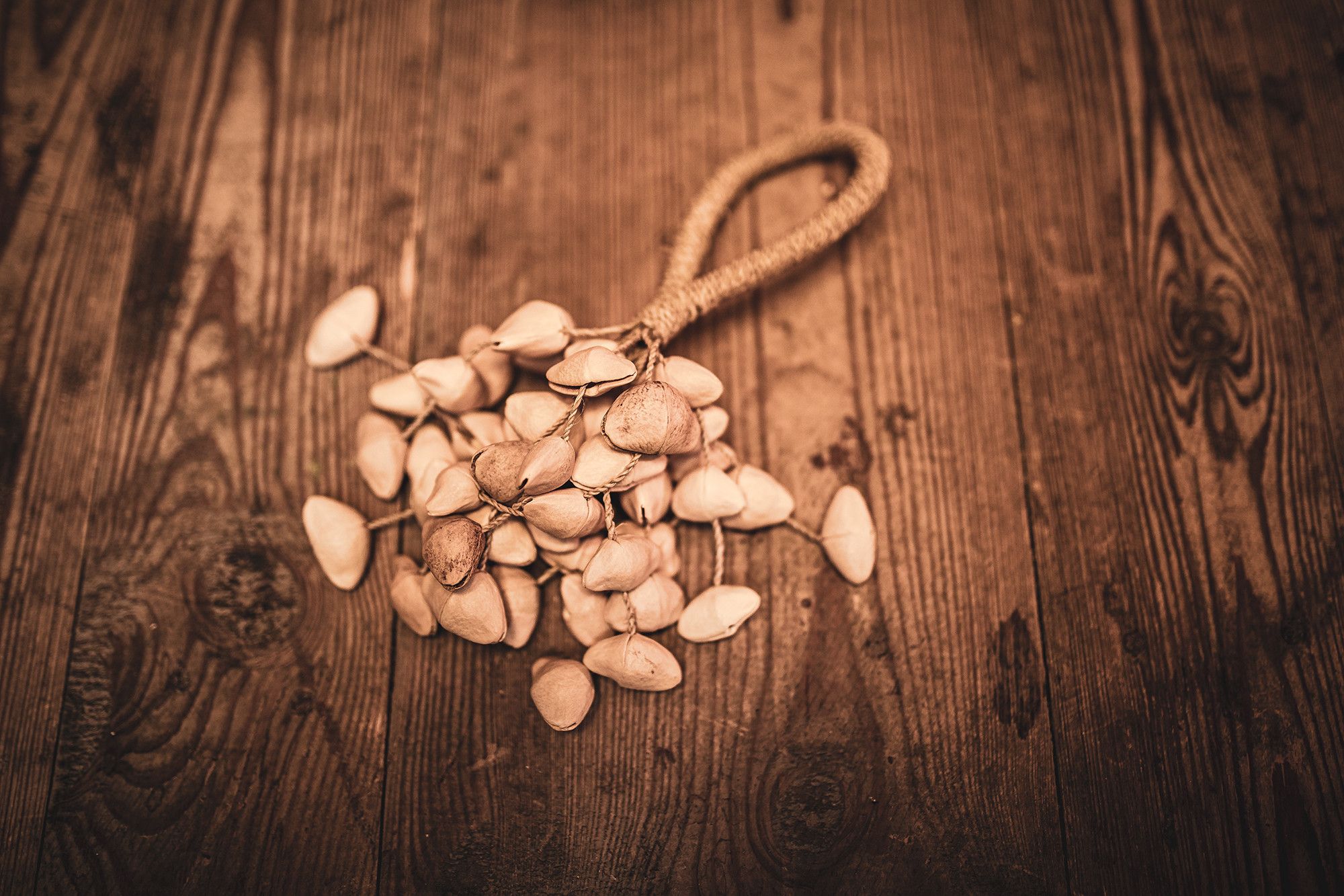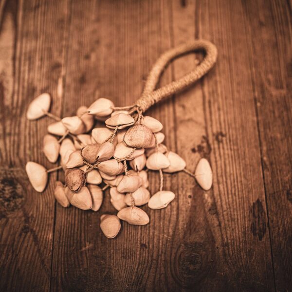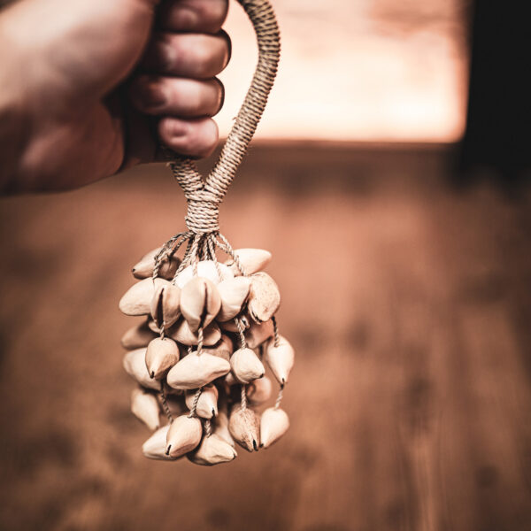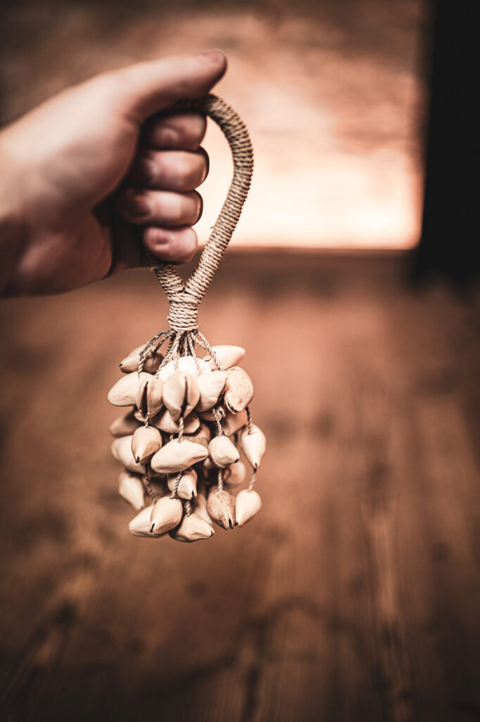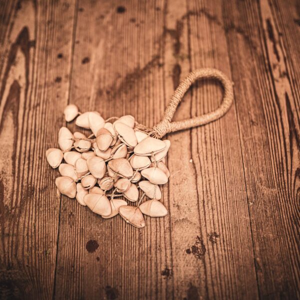 I gusci di noce di semi di Kenari, fissati a una cinghia da polso, creano uno strumento unico e versatile.