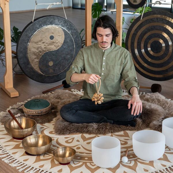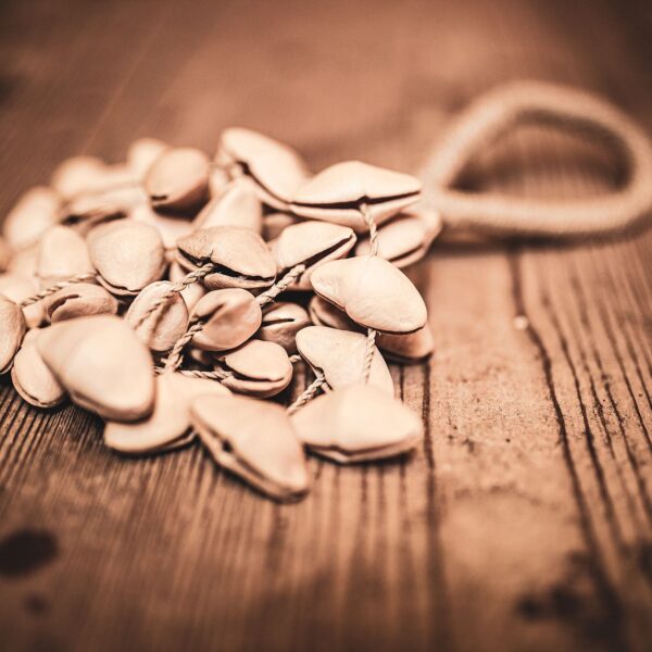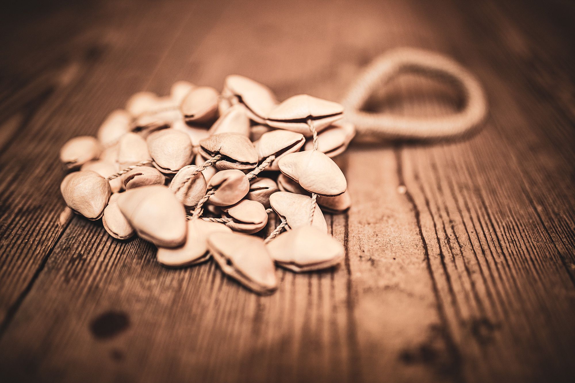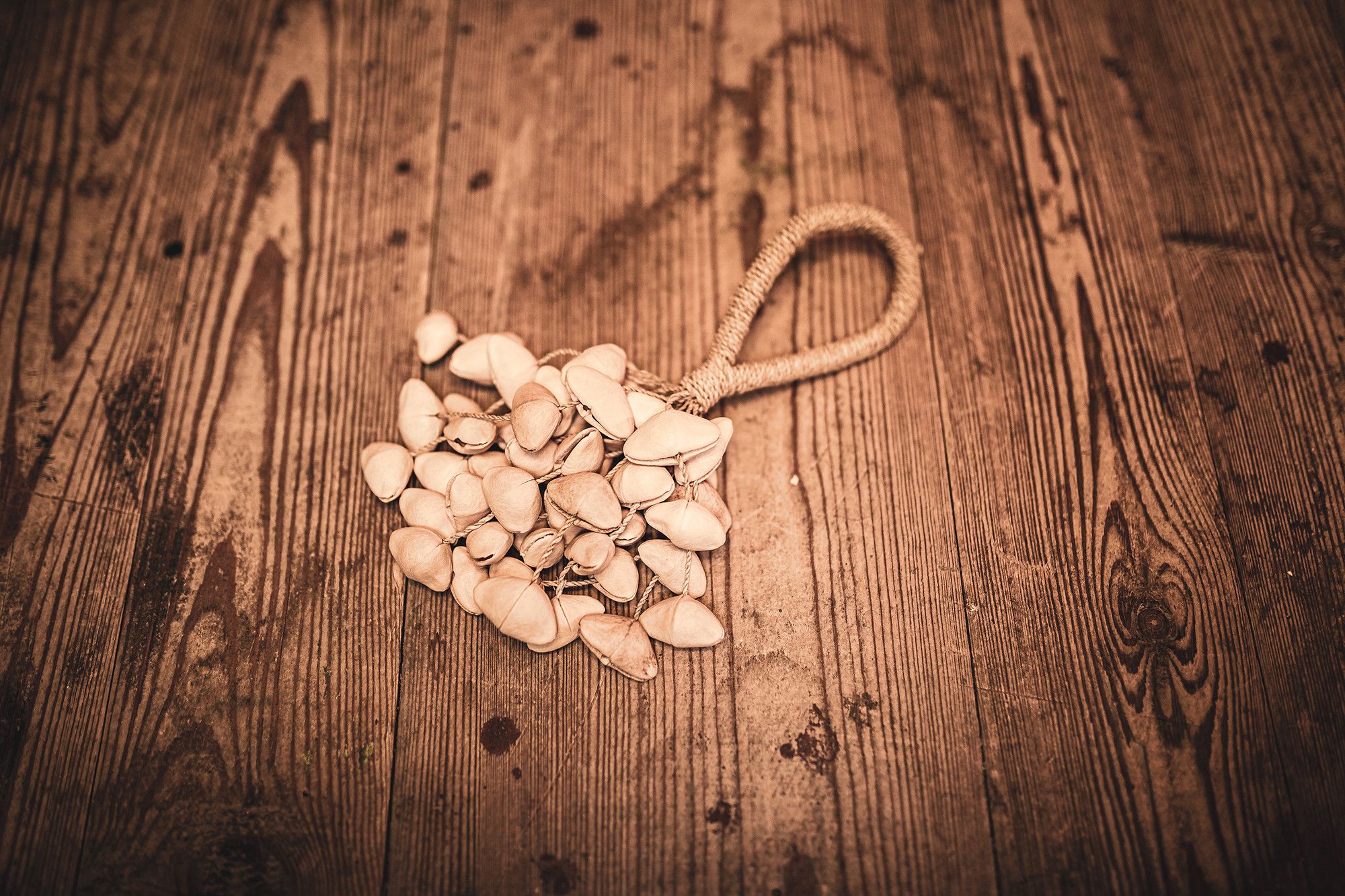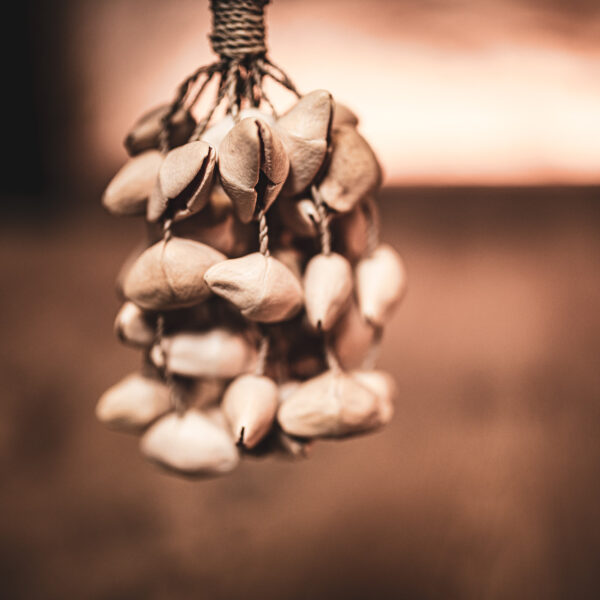 I gusci di noce di semi di Kenari, fissati a una cinghia da polso, creano uno strumento unico e versatile.