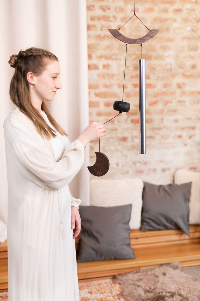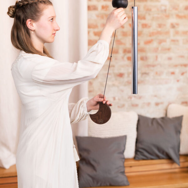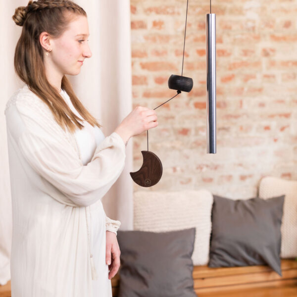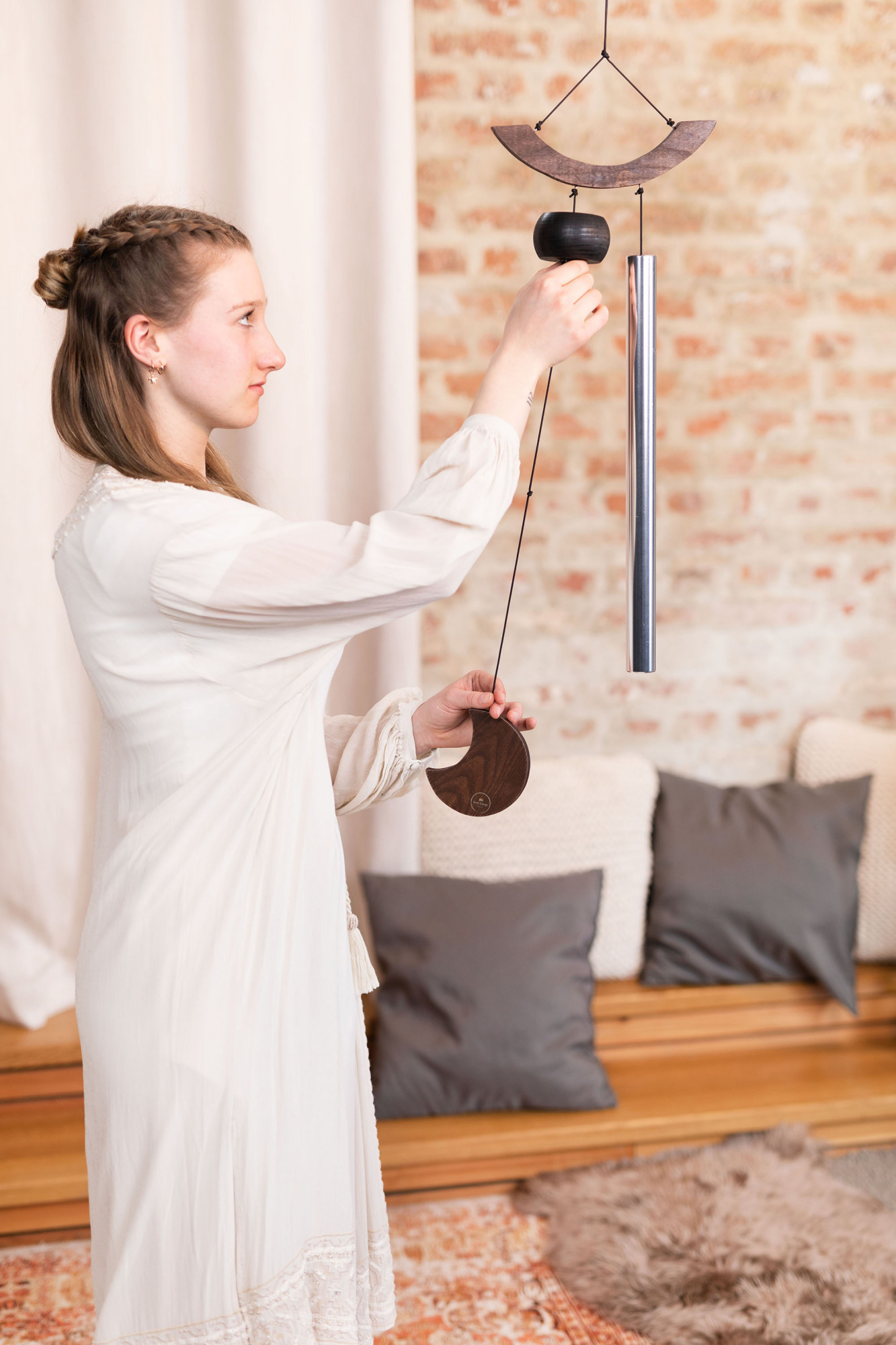 La base in legno massello e l'ispirazione lunare conferiscono un design elegante e simbolico, richiamando energia e serenità . Ideali per sessioni di rilassamento, yoga e pratiche di mindfulness, i Moon Meditation Chimes offrono un'esperienza sonora che favorisce il benessere psicofisico.