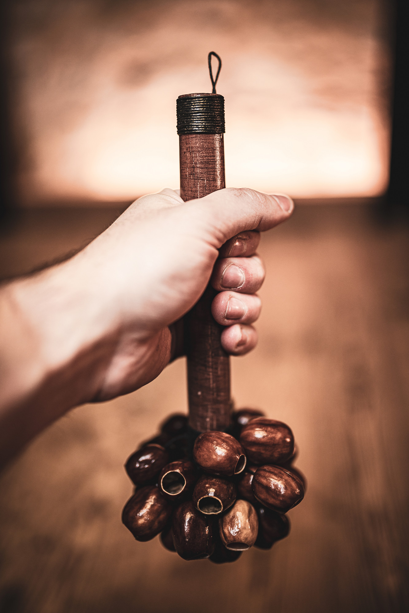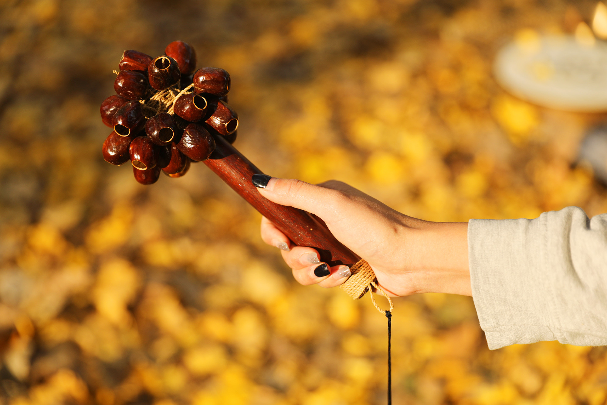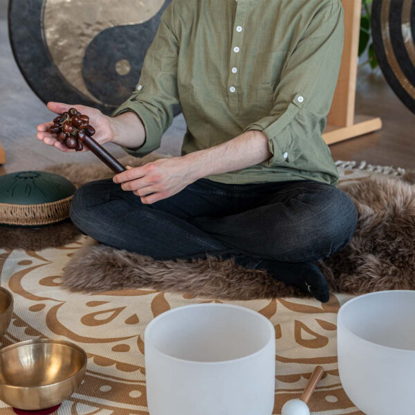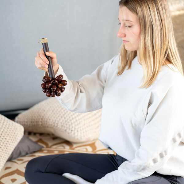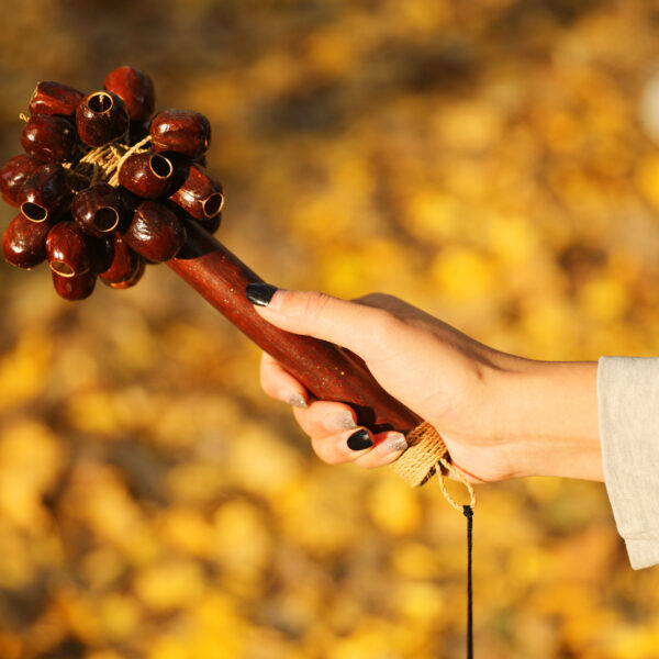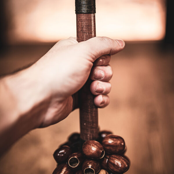I gusci di noce dei semi di Pala, fissati a un'asta, creano uno strumento unico e versatile.