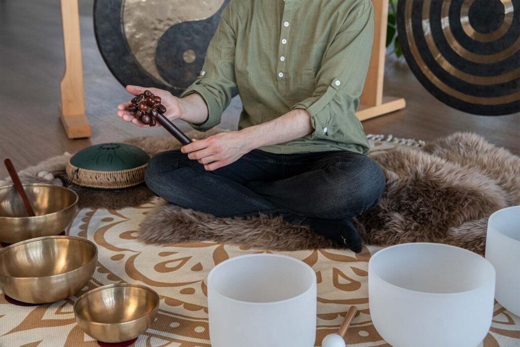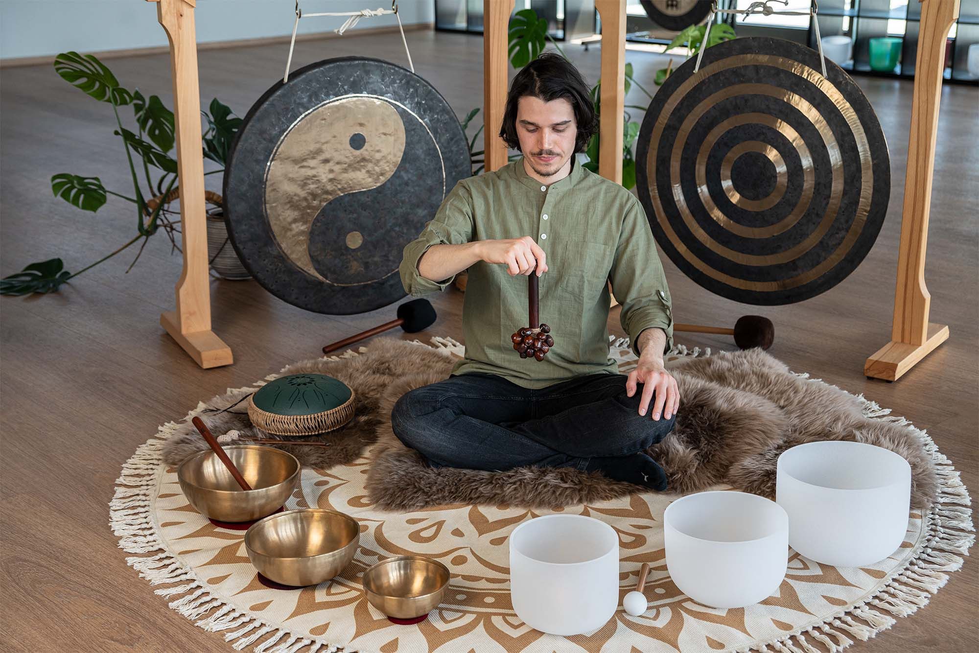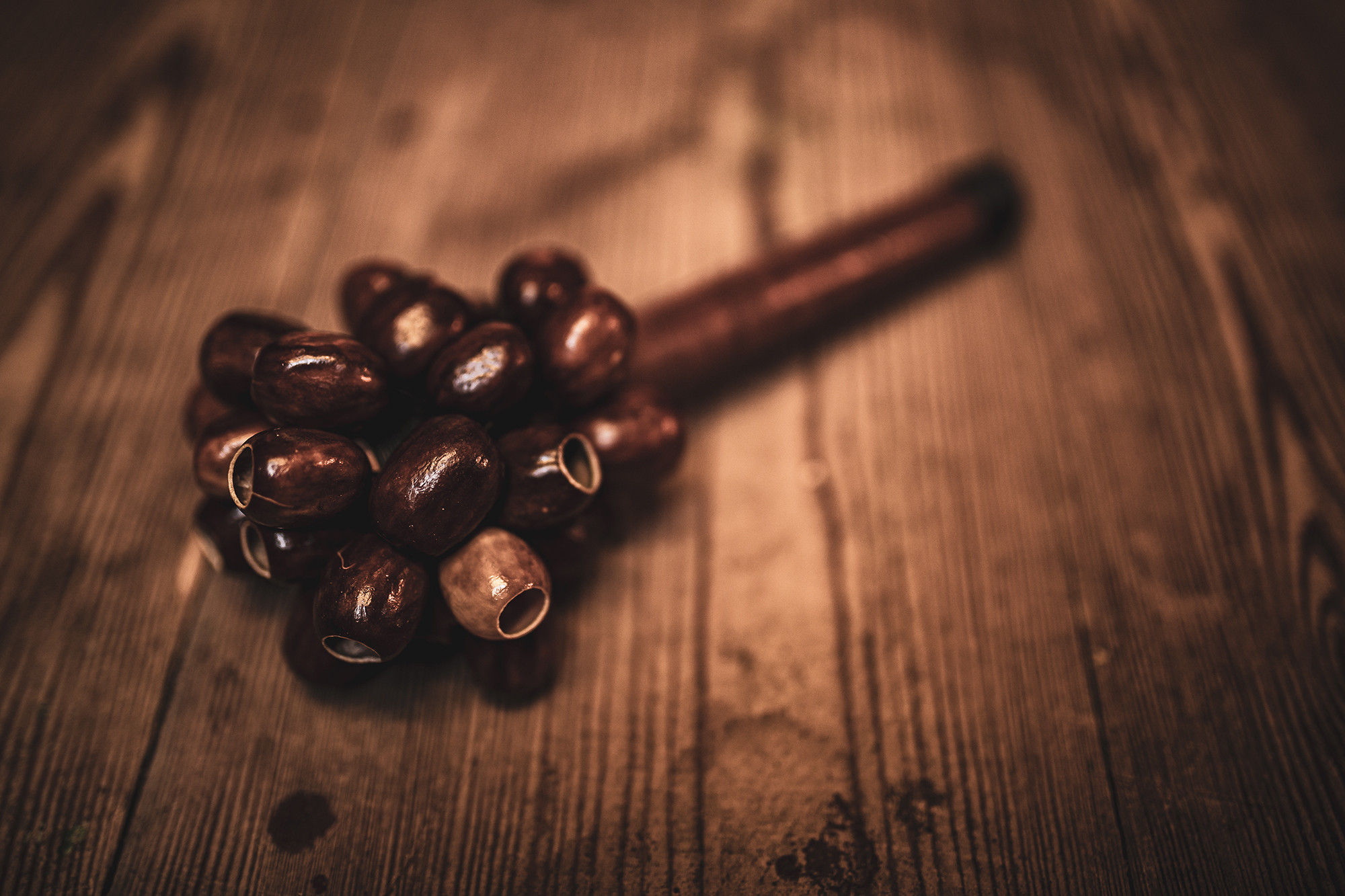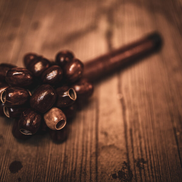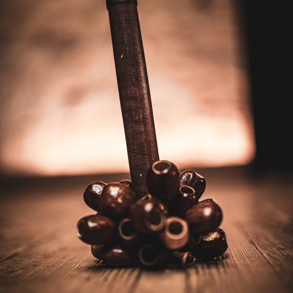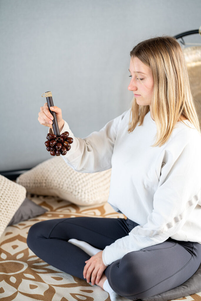 I gusci di noce dei semi di Pala, fissati a un'asta, creano uno strumento unico e versatile.