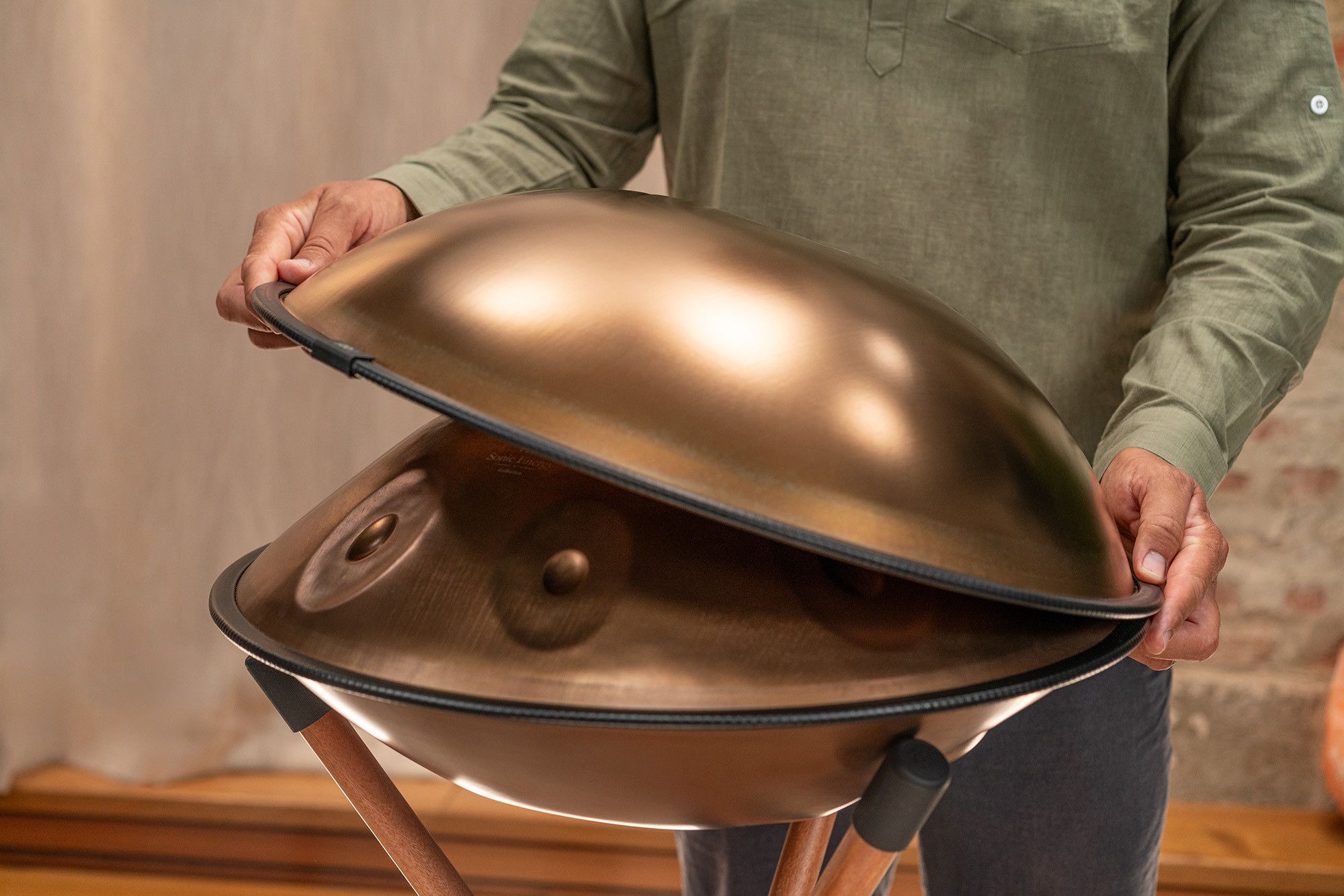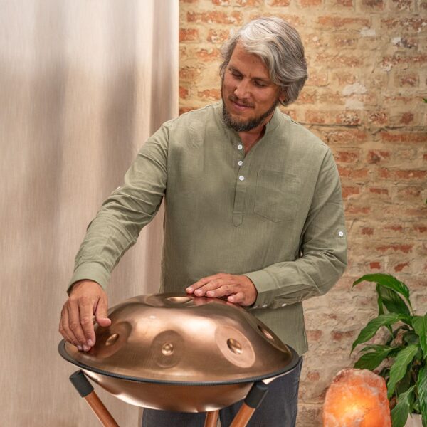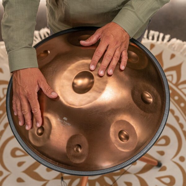 I Sensory Handpan Sonic Energy sono costruiti a mano, singolarmente, con acciaio inossidabile di alta qualità, con finitura dorata vintage. Si tratta di un materiale che non teme le intemperie e che tiene l'accordatura nel tempo. Ogni nota completa le altre, traducendosi in un suono rilassante e cristallino. Facili da suonare anche per chi non ha dimestichezza con lo strumento, i Sensory Handpan hanno due fori sonori rivolti verso l'esterno in direzioni opposte per fornire un effetto completamente coinvolgente sia per il musicista che per gli ascoltatori. Inclusi in tutti gli handpan ci sono due tubi sonori rimovibili che consentono di alterare le qualità tonali dello strumento. Il tubo più lungo è posizionato nel foro rivolto verso le note più basse dell'handpan, e il tubo più corto rivolto verso le note più acute.