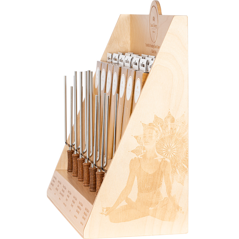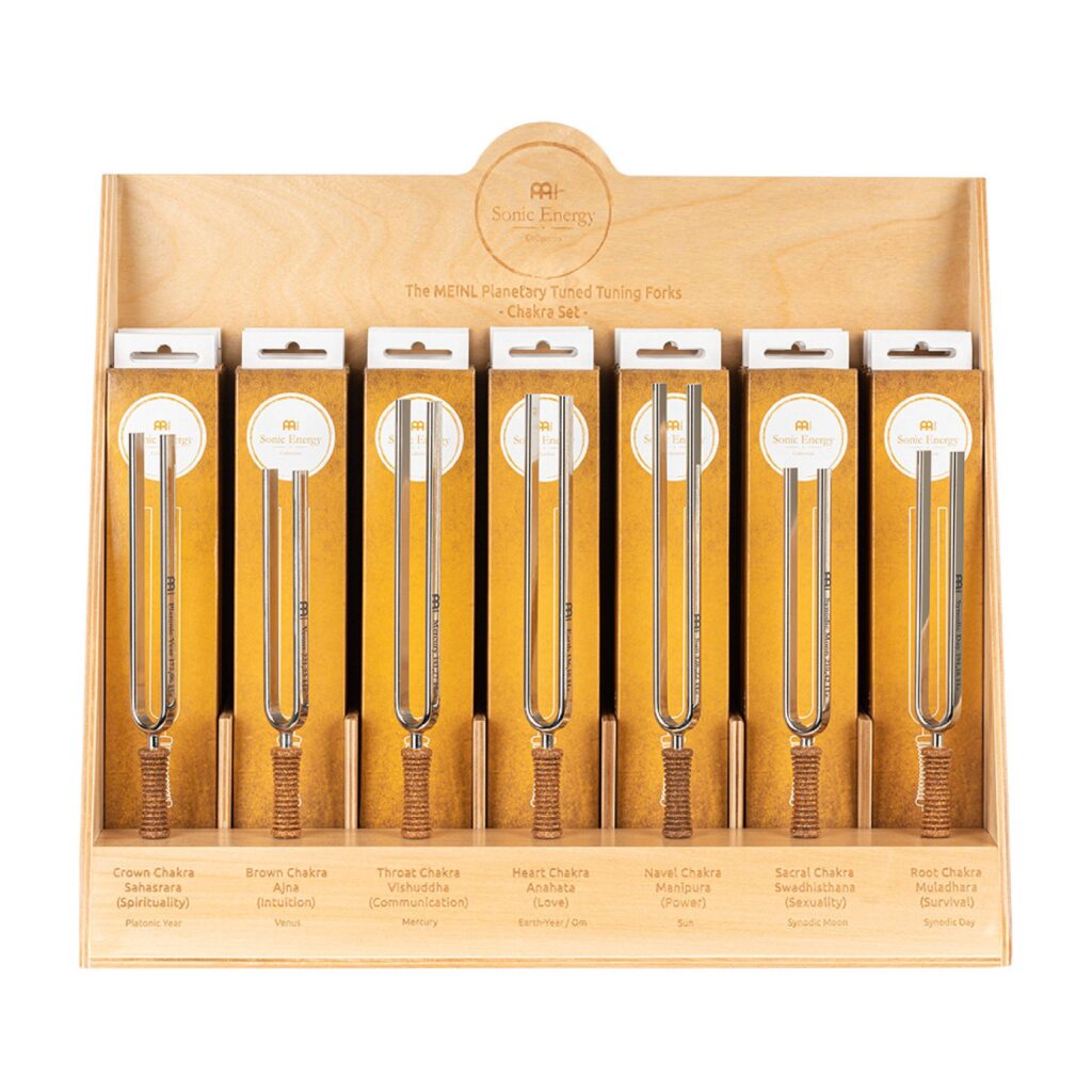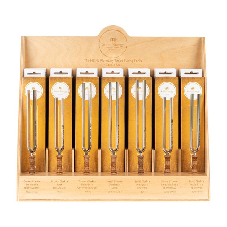 L'espositore di diapason a energia sonora MEINL offre 21 diapason planetari in un unico set – 7 diapason chakra da 3 pezzi ciascuno. Tutti questi diapason planetari sono capolavori artigianali realizzati in Germania con logo e informazioni di sintonia incisi.
