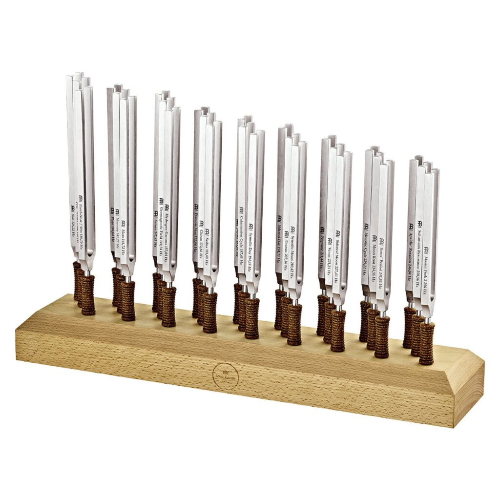 I Meinl Sonic Energy Therapy Tuning Fork Holder prodotte in Germania seguendo il calcolo di Hans Cousto, ovvero l'ottava Cosmica, vengono accordati esattamente alla frequenza del rispettivo corpo celeste per ottenere un effetto terapeutico, di conseguenza sono più grandi e pesanti permettendo loro di oscillare più a lungo e di essere efficaci al massimo delle sue prestazioni durante un trattamento terapeutico professionale. Il set include 27 Tuning Fork, ognuno per ogni chakra, logo e informazioni sull'accordatura incisi