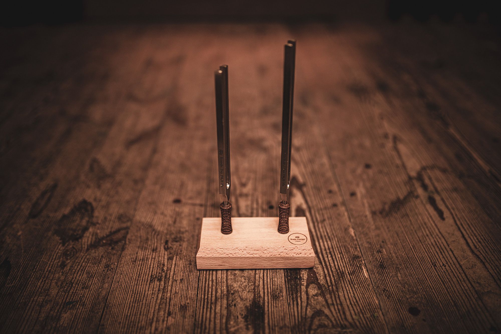 I Meinl Sonic Energy Therapy Tuning Fork Holder prodotte in Germania seguendo il calcolo di Hans Cousto, ovvero l'ottava Cosmica, vengono accordati esattamente alla frequenza del rispettivo corpo celeste per ottenere un effetto terapeutico, di conseguenza sono più grandi e pesanti permettendo loro di oscillare più a lungo e di essere efficaci al massimo delle sue prestazioni durante un trattamento terapeutico professionale. Il set include due Tuning Fork, logo e informazioni sull'accordatura incisi